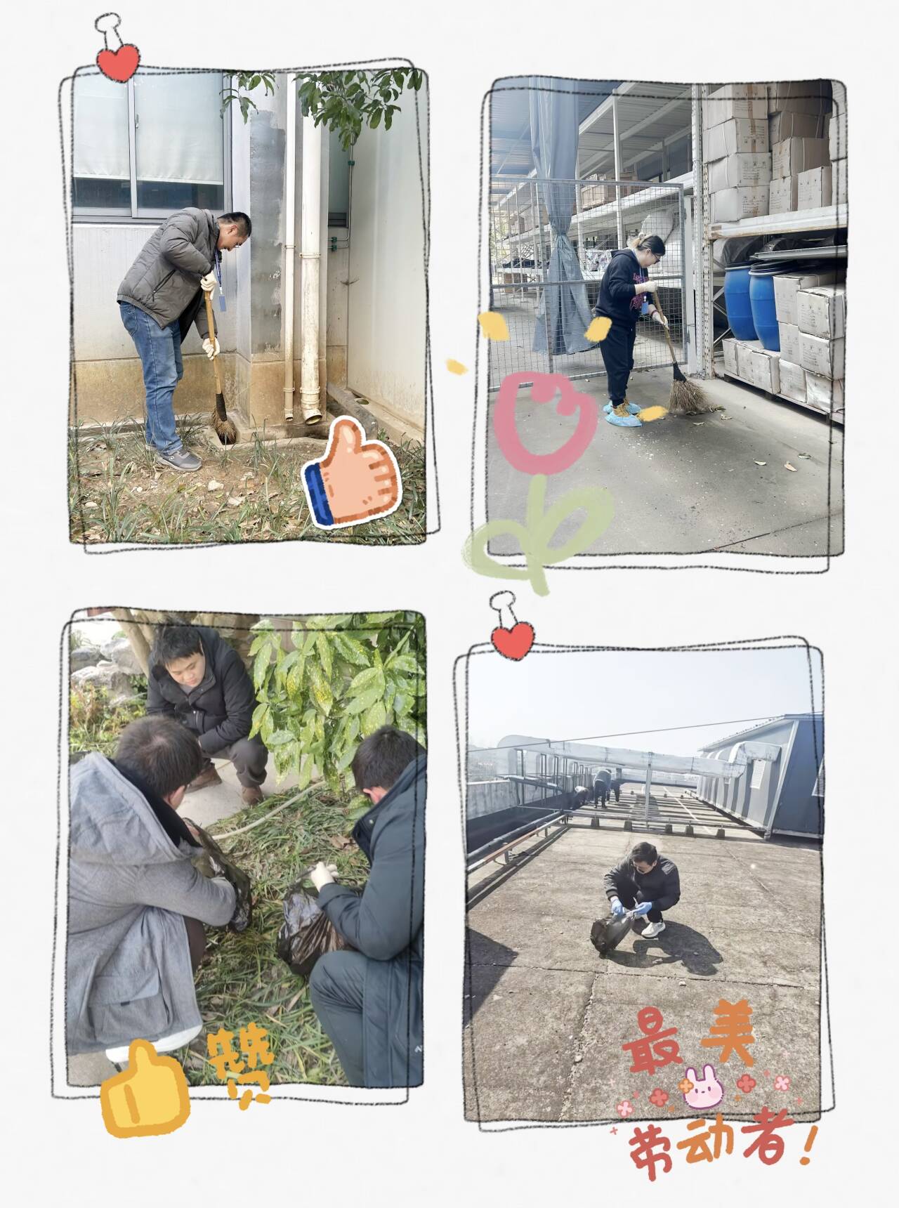 各部門同事們紛紛響應(yīng)號(hào)召,如同一股股清泉匯聚,大家秉持著不怕臟、不怕累的熱忱,以昂揚(yáng)的斗志投入打掃中???,那在樓頂清掃的同事,宛如大樓“美容師”,專注地拂去每一絲塵埃,讓樓頂在陽(yáng)光的照耀下熠熠生輝;而清理倉(cāng)庫(kù)周邊雜草的同事們,正在拔除歲月滋生的雜亂,為倉(cāng)庫(kù)周邊重塑整潔輪廓。在這場(chǎng)大掃除里,每個(gè)人都是主角,齊心協(xié)力為公司區(qū)域的每一寸土地注入清新與活力。大家在共同勞作中,深切體會(huì)到維護(hù)公司公共環(huán)境的責(zé)任之重,那份強(qiáng)烈的責(zé)任感與使命感,如同璀璨星辰,照亮了企業(yè)環(huán)境建設(shè)的前行之路。
