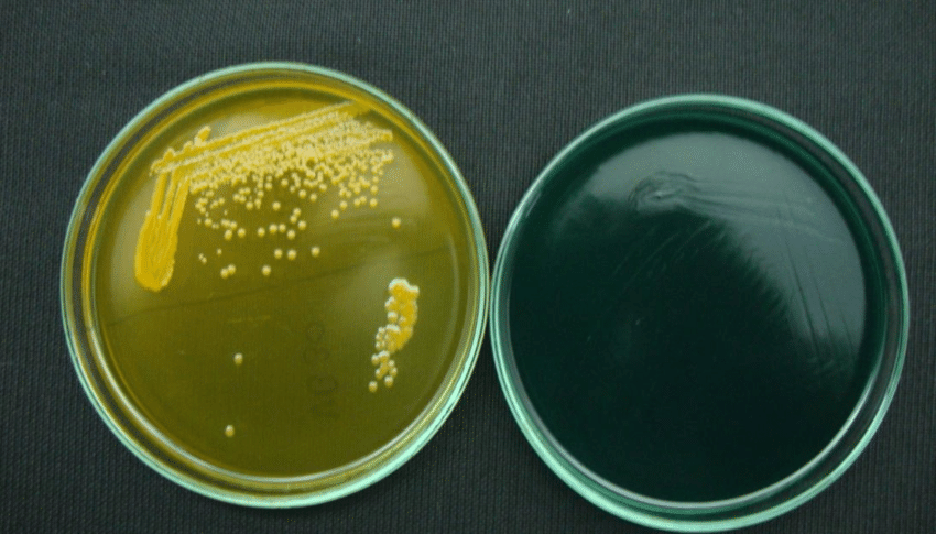 TCBS瓊脂培養(yǎng)基,用于致病性弧菌(霍亂、副溶血性弧菌)的選擇性分離培養(yǎng)(GB2008、SN標(biāo)準(zhǔn))。組成成分:酵母粉 5.0 , 蛋白胨10.0, 硫代硫酸鈉10.0, 枸櫞酸鈉10.0, 牛膽粉5.0, 牛膽酸鈉3.0 , 蔗糖20.0 , 氯化鈉10.0, 檸檬酸鐵1.0 , 麝香草酚蘭0.04, 瓊脂15.0, pH值8.6 ± 0.1,保存溫度25℃。膽酸鈉、牛膽粉、硫代硫酸鈉和檸檬酸鈉及較高的pH可抑制革蘭氏陽性菌和大腸菌群;霍亂弧菌對酸性環(huán)境比較敏感,因此該pH值可增強其生長;硫代硫酸鈉與檸檬酸鐵反應(yīng)作為檢測硫化氫產(chǎn)生的指示劑;溴麝香草酚蘭和麝香草酚蘭是pH指示劑;瓊脂是培養(yǎng)基的凝固劑。