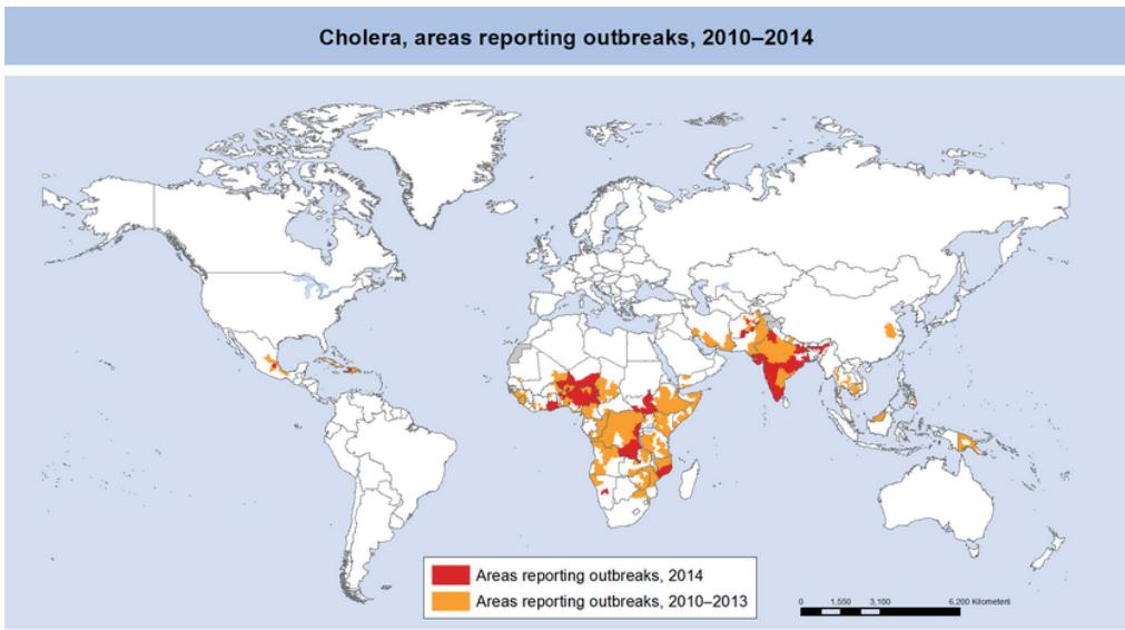 各型弧菌產(chǎn)生類似的腸毒素,臨床表現(xiàn)也類似。每 一 次霍亂流行都會有一個特定的優(yōu)勢型,且流行趨勢是在不斷變化的。根據(jù)世界衛(wèi)生組織的報告,2010年至2014年全球霍亂爆發(fā)區(qū)域見圖。
