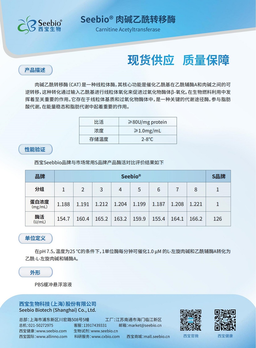 肉堿乙酰轉(zhuǎn)移酶(CAT)是一種線粒體酶,其核心功能是催化乙?;谝阴]o酶A和肉堿之間的可逆轉(zhuǎn)移,這種轉(zhuǎn)化通過輸入乙酰基進(jìn)行線粒體氧化來促進(jìn)過氧化物酶體β-氧化,在生物燃料利用中發(fā)揮著至關(guān)重要的作用。它存在于線粒體基質(zhì)和過氧化物酶體中,是一種關(guān)鍵的代謝途徑酶,參與脂肪酸代謝,在能量穩(wěn)態(tài)和脂肪代謝中起著重要的作用。