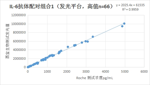 西寶IL-6抗體配對1高值部分(<4000pg/mL)的發(fā)光值與Roche IL-6試劑臨床相關(guān)性R2>0.95。