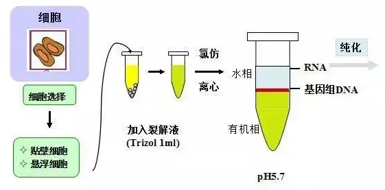 當加入氯仿時,它可抽提酸性的苯酚,而酸性苯酚可促使RNA進入水相,離心后可形成水相層和有機層,這樣RNA與仍留在有機相中的蛋白質(zhì)和DNA分離開。