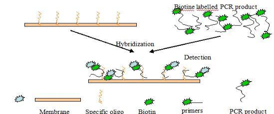 其主要原理是,利用短的寡核苷酸序列作為探針,并點(diǎn)到硝酸纖維素膜或尼龍膜上,再將待測(cè)的DNA樣本(一般是經(jīng)PCR特意性擴(kuò)增的產(chǎn)物,在PCR引物5’端預(yù)先進(jìn)行生物素標(biāo)記,使擴(kuò)增產(chǎn)物相應(yīng)標(biāo)記有生物素)與之雜交,形成穩(wěn)定的雙鏈結(jié)構(gòu),如果目標(biāo)序列中存在變異,那么探針與目標(biāo)序列的雜交將會(huì)收到影響,導(dǎo)致雜交信號(hào)的變化。通過(guò)在不同位置固定數(shù)十甚至數(shù)百種等位基因,只需要一次雜交,就可以實(shí)現(xiàn)多種等位基因的篩查。