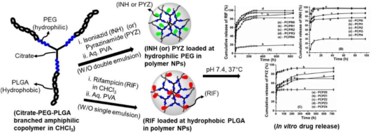 再者利福平 (RIF)、異煙肼 (INH)和吡嗪酰胺(PYZ),基于PLGA- PEG的兩親性支化共聚物納米粒子(NPs) 已開發(fā)用于結(jié)核病 (TB) 藥物的控釋。支化 PLGA-PEG 的共聚物 NP 表現(xiàn)出初始爆發(fā)釋放,隨后持續(xù)釋放 RIF 840 小時(shí)、INH 72 小時(shí)和 PYZ 720 小時(shí)。與線性類似物相比,良好的數(shù)據(jù)讓支化檸檬酸酯-PEG-PLGA 共聚物納米顆粒可作為潛在的藥物載體[10]。
