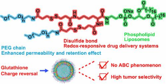 PEG修飾生物分子一般有主要的連接鍵有酰胺鍵、醚鍵、酯鍵和二硫鍵等等,不同的連接鍵性質(zhì)也會對PEG-Lipid在體內(nèi)的穩(wěn)定性,靶標(biāo)內(nèi)濃度和釋放速度產(chǎn)生相應(yīng)的影響。例如研究人員針對腫瘤細(xì)胞的酸性環(huán)境,開發(fā)酸性環(huán)境中可裂解PEG-Lipid的連接鍵(半縮醛,pH敏感的苯甲酸酯等),或在PEG主鏈上插入酸性敏感的化學(xué)修飾(如-S-S-,硼酸酯等等)來增加載藥脂質(zhì)體在目標(biāo)靶標(biāo)中釋放藥物[12]- [14]。