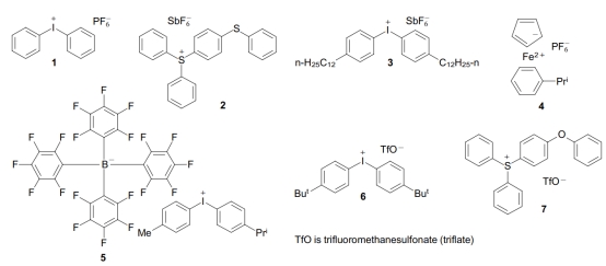 應(yīng)用比較廣泛的是二芳基鎓碘鹽/三芳基磺酸鹽,含有BF4-, SbF6-, AsF6-, PF6-, 或者RSO3-等陰離子是應(yīng)用廣泛的PAG。二茂鐵的離子化合物也是比較知名的,但是應(yīng)用范圍相對較窄。與三芳基磺酸鹽相比,二芳基硫鎓鹽基光酸產(chǎn)生的酸具有更高的量子產(chǎn)率,因此,當(dāng)需要高產(chǎn)酸率的工藝時,例如,用于制造光固化涂層,印刷油墨和不干膠標(biāo)簽,這類PAG是選項(xiàng)。另一方面,三芳基磺酸鹽的高熱穩(wěn)定性是其作為光刻膠用PAG的主要因素。光刻膠受到曝光前和曝光后的烘烤,在鎓鹽熱穩(wěn)定性不足的情況下,可能會損害圖像質(zhì)量。此外,含二苯鎓鹽的PAG的光解產(chǎn)生的揮發(fā)性碘取代的光產(chǎn)物會物沉積在用于曝光光刻膠的設(shè)備的光學(xué)器件上。單三苯磺酸基PAG的光解則不伴有揮發(fā)性光產(chǎn)物的形成[6]。