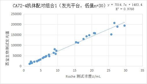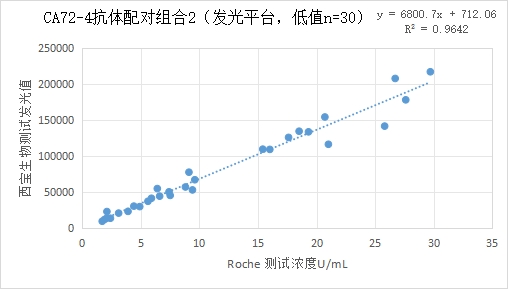 西寶CA72-4抗體配對低值部分(≤30U/mL) 的發(fā)光值與Roche CA72-4試劑臨床相關性R2>0.95;