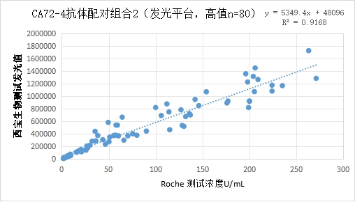 西寶CA72-4抗體配對高值部分(<300U/mL)的發(fā)光值與Roche CA72-4試劑臨床相關性R2>0.90。