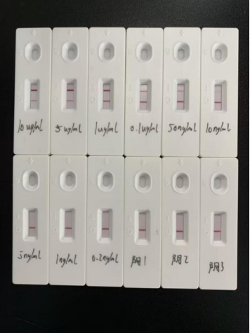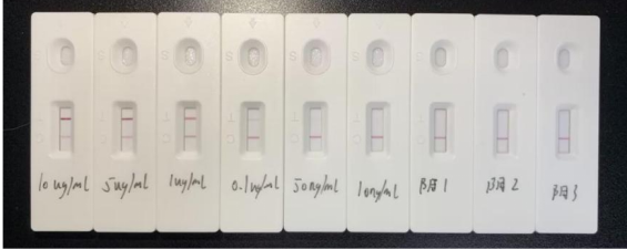 2.1.4 實(shí)驗(yàn)結(jié)果:在膠體金免疫層析平臺(tái),采用此抗體配對(duì)組合測(cè)試腺病毒(ADV)抗原稀釋梯度均顯色,測(cè)試三例陰性樣品均不顯色,靈敏度可達(dá)10ng/mL,表明此抗體配對(duì)在膠體金層析平臺(tái)測(cè)試性能良好。
