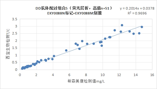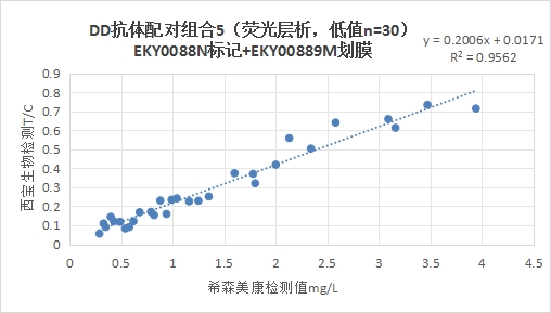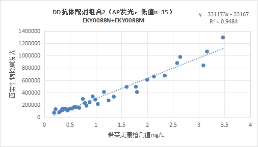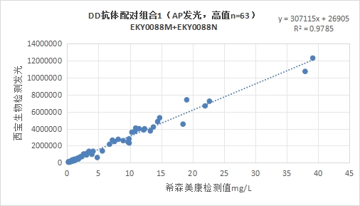 西寶DD抗體配對組合5(<15mg/L)的發(fā)光值與希森美康DD試劑臨床相關(guān)性R2>0.95。
