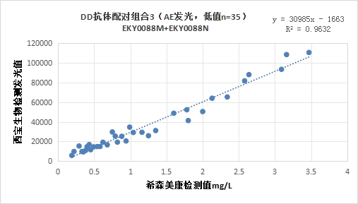 西寶DD抗體配對組合3(<40mg/L)的發(fā)光值與希森美康DD試劑臨床相關(guān)性R2>0.95。