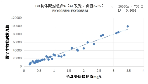 西寶DD抗體配對組合4(<4mg/L)的發(fā)光值與希森美康DD試劑臨床相關(guān)性R2在0.95左右;