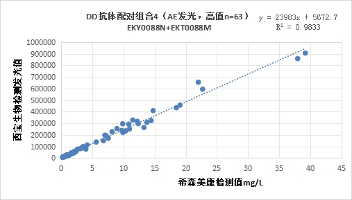 西寶DD抗體配對組合4(<40mg/L)的發(fā)光值與希森美康DD試劑臨床相關(guān)性R2>0.95。