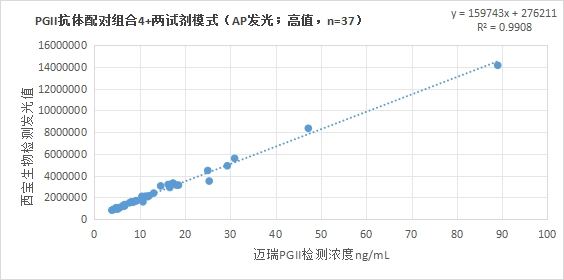 西寶生物發(fā)光(AP)平臺PGII抗體配對組合4(兩試劑模式)與邁瑞醫(yī)療PGII試劑(化學發(fā)光法)賦值的臨床樣本相關性R2>0.95,相關性良好;